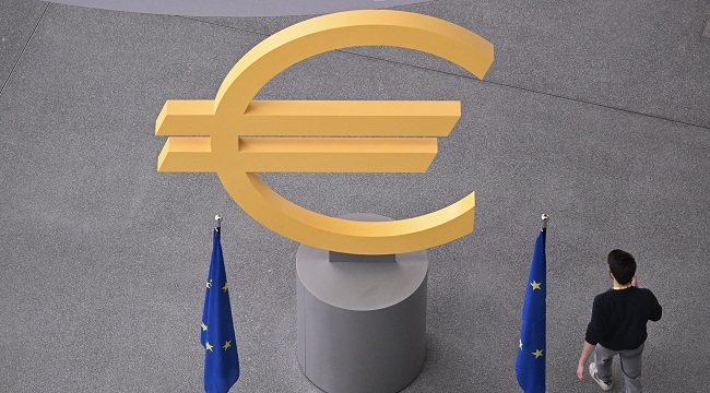 A euro currency sign is pictured inside the headquarters building of the European Central Bank (ECB) as a person walks by ahead of a press conference following the meeting of the governing council of the ECB in Frankfurt am Main, western Germany, on June 6, 2024. – The European Central Bank is expected to start cutting interest rates from record highs, its first reduction in nearly five years, but volatile inflation means the path ahead is uncertain. (Photo by Kirill KUDRYAVTSEV / AFP)