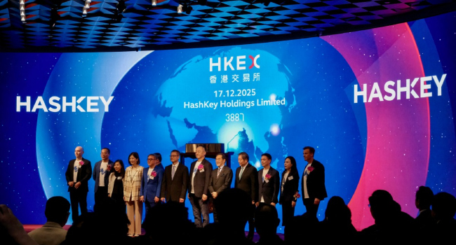 Shares in HashKey Group, which was established in 2018 and runs an exchange alongside other ventures, ended the morning down 2.69 percent at HK$6.50 (US$0.84) on its market debut, having raised US$205 million in its initial public offering.