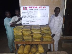 “In Kebbi, NDLEA operatives on patrol along Bagudo road on Friday 18th April intercepted a vehicle loaded with bags of charcoal coming from Malabil, Benin Republic. A search of the vehicle led to the recovery of 97kg skunk concealed in the sacks of charcoal. Three suspects: Abubakar Ibrahim, 50; Mustapha Aliyu, 32; and Bashar Lawali, 28, were arrested in connection with the seizure.”